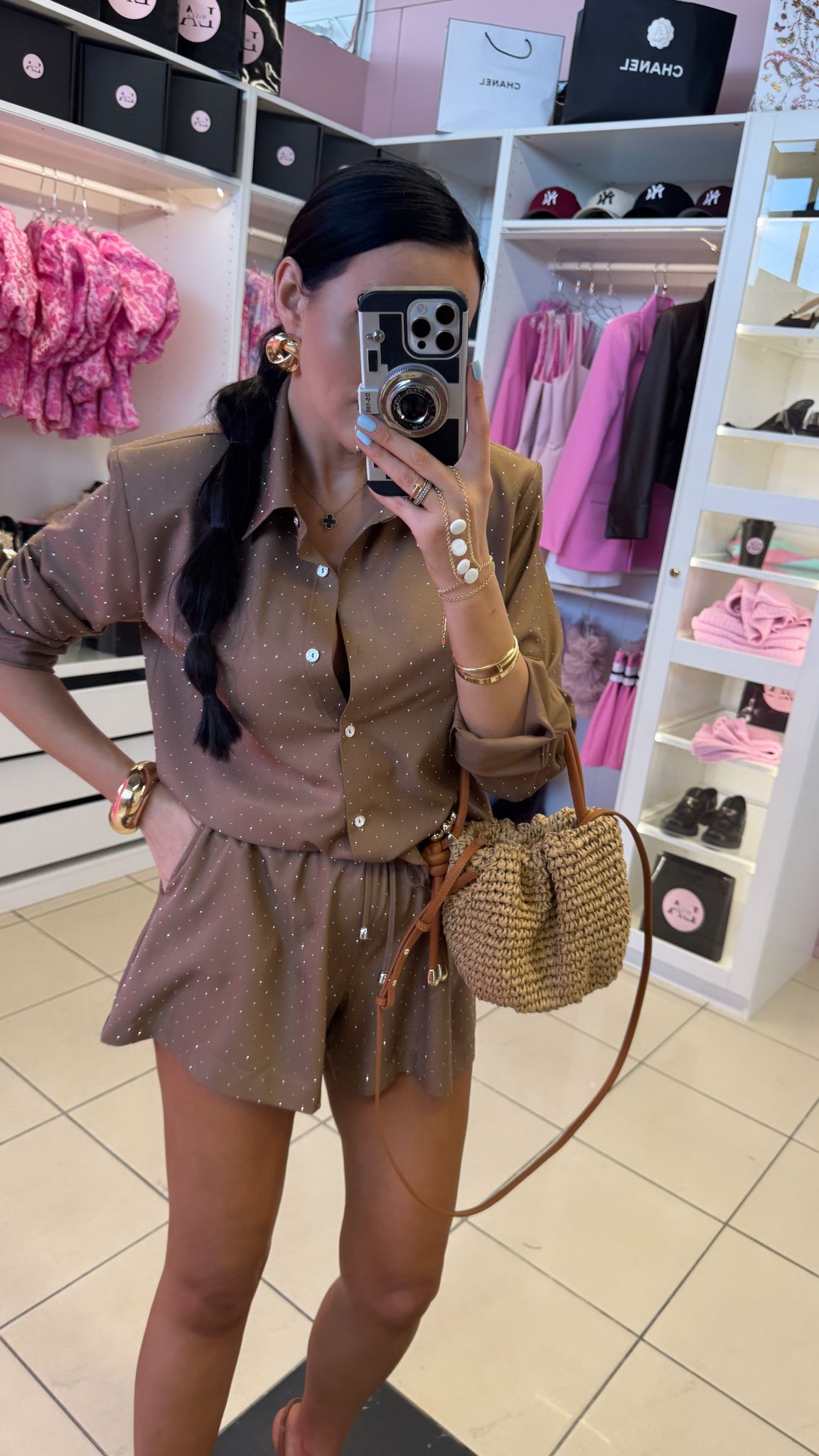 Noś go jako total look z sandałkami na obcasie lub oddzielnie – koszulę zestaw z ulubionymi jeansami, a spodenki z gładkim topem. To zestaw, który przyciąga wzrok!